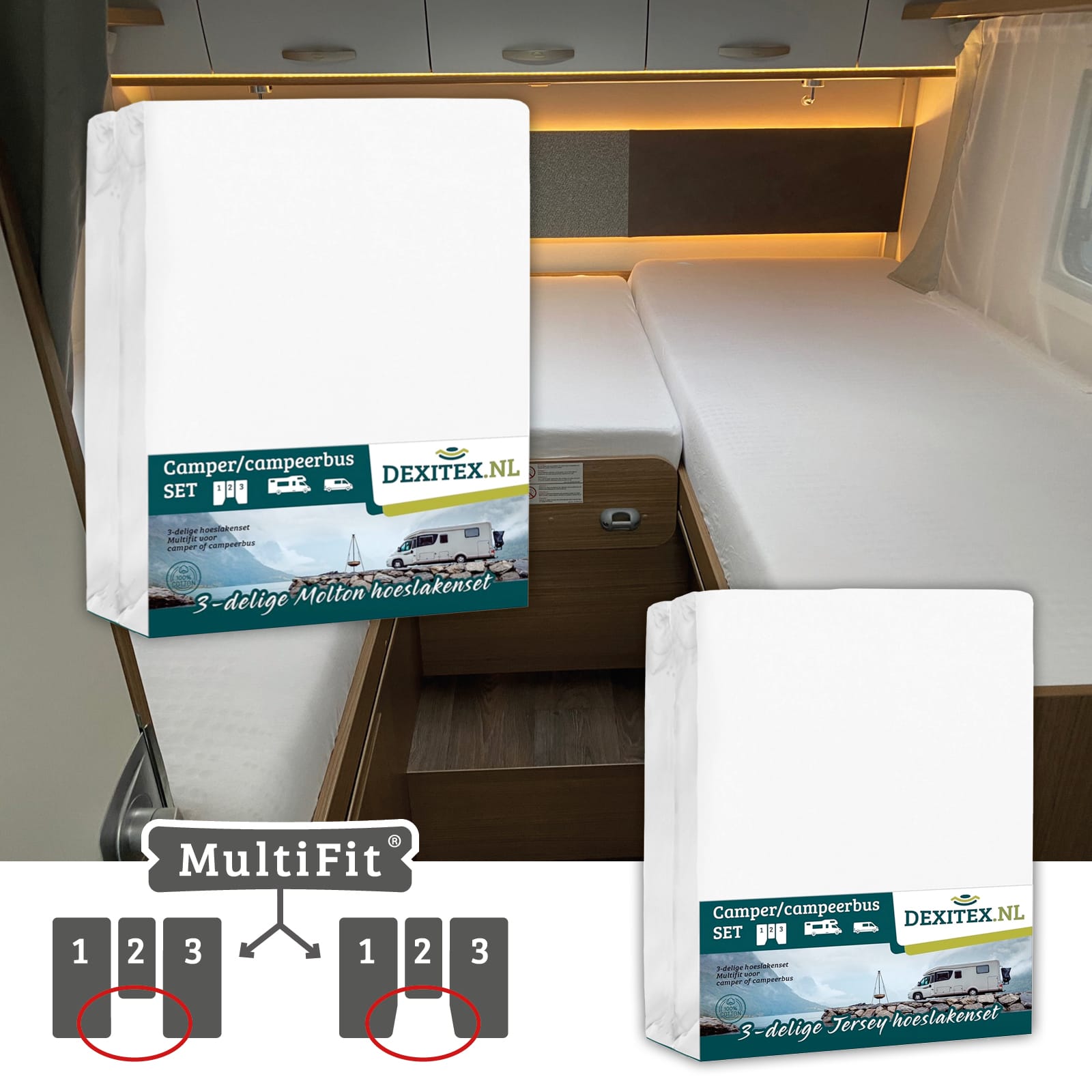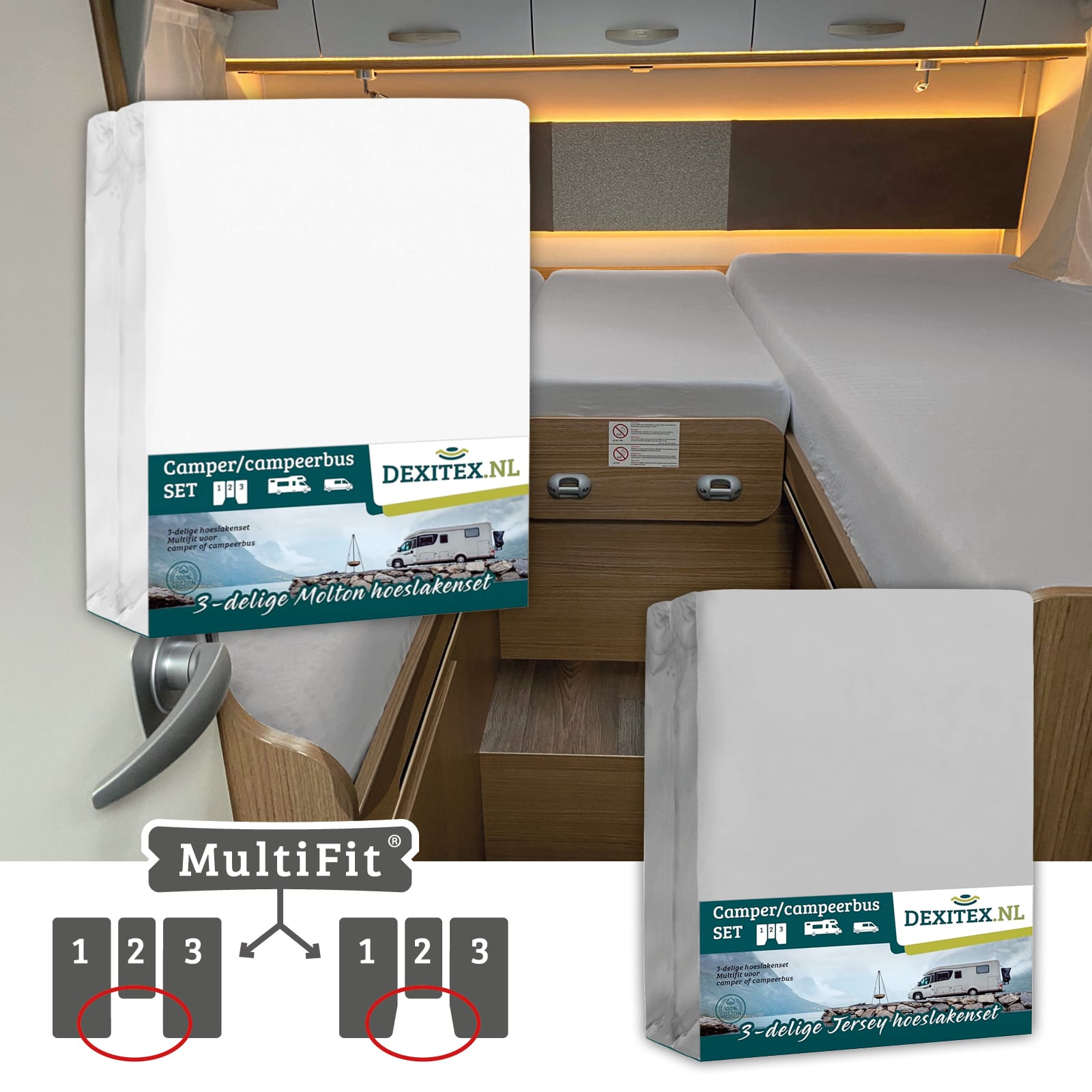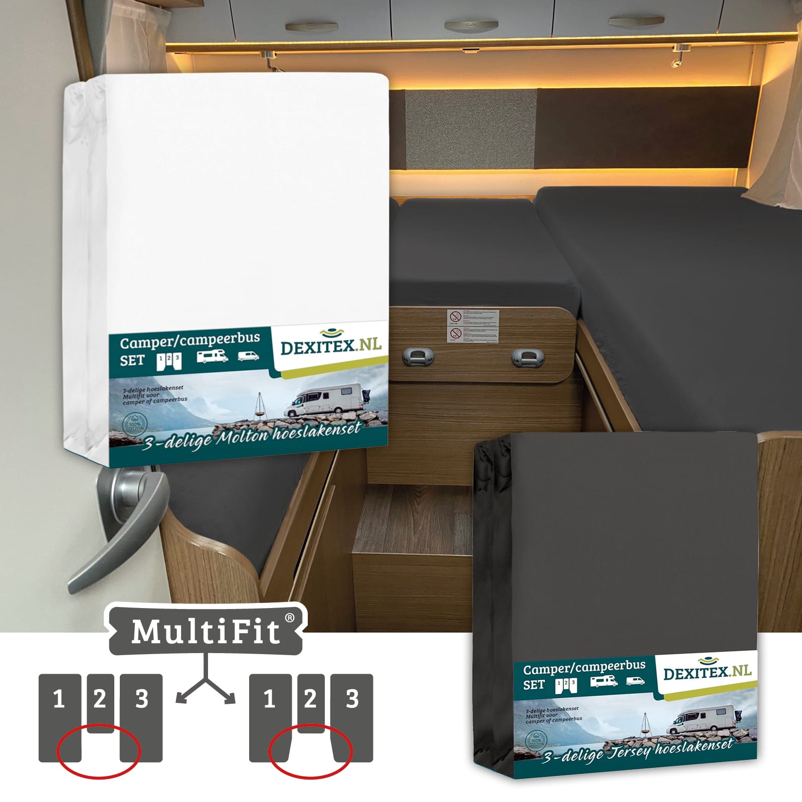 Este juego de sábanas bajeras está especialmente diseñado para la disposición de colchones de 3 piezas en autocaravana o caravana. El juego contiene 3 sábanas bajeras. Una para el colchón izquierdo, otra para el colchón derecho y otra especialmente confeccionada para la parte central. Así los 3 colchones quedan perfecta y ordenadamente confeccionados.
