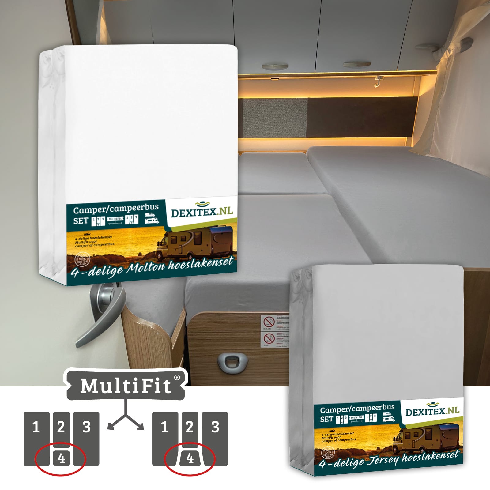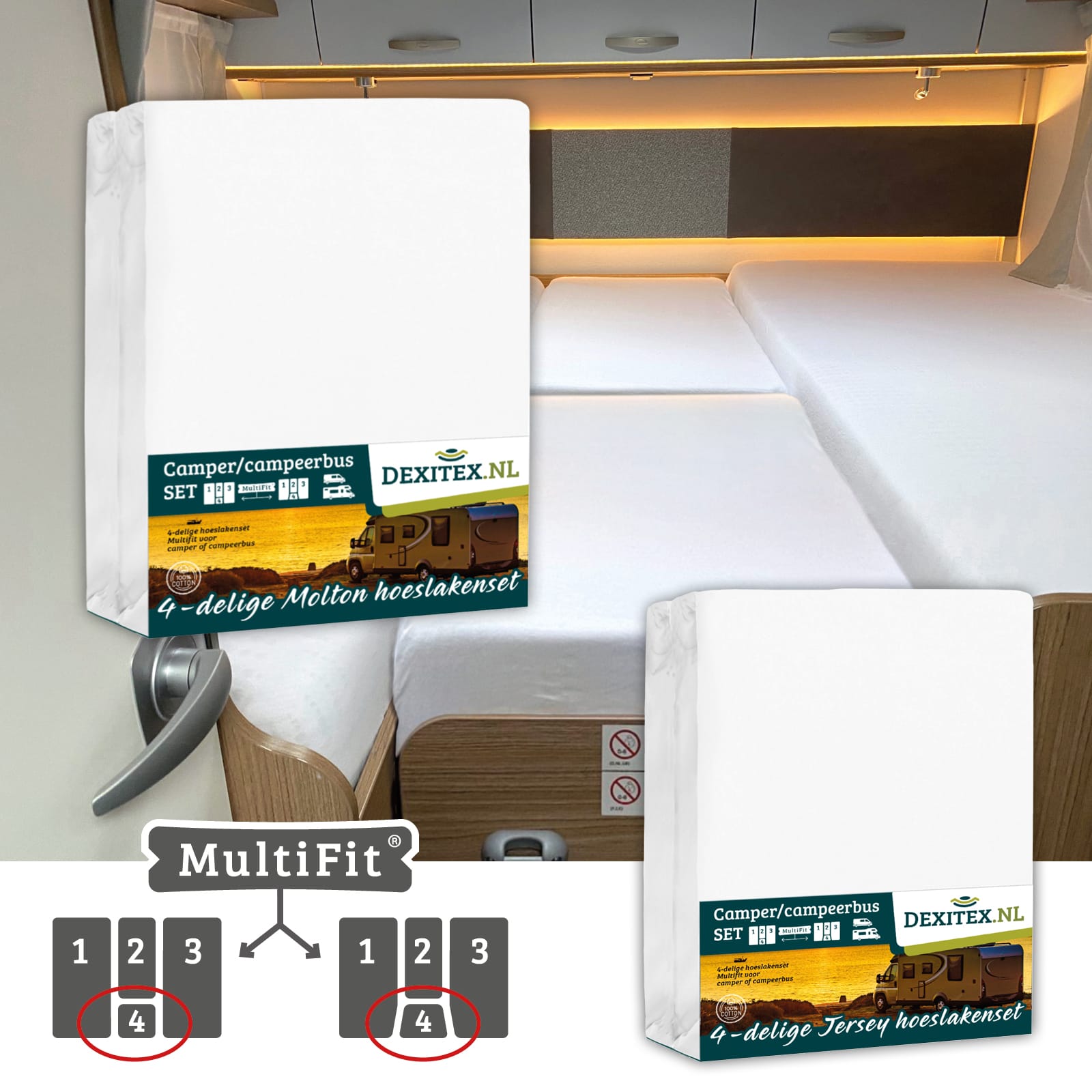 Este juego de sábanas bajeras está especialmente diseñado para la disposición de colchones de 4 piezas en autocaravana o caravana. El juego contiene 4 sábanas bajeras. Una para el colchón izquierdo, otra para el derecho y dos especialmente confeccionadas para la parte central. Así todos los colchones quedan perfecta y ordenadamente confeccionados.