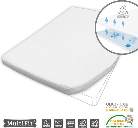 En cuanto a las dimensiones, hemos desarrollado estos Muletones impermeables con un ajuste MultiFit®, lo que significa que estos Muletones impermeables se fabrican con 3 ángulos diferentes, de modo que son perfectos para colchones de cama francesa con una anchura de 130 a 160 cm, la longitud es de unos 200 cm. ¡Muy flexibles!